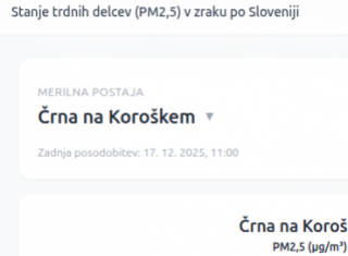 Prikaz stanja trdnih delcev (PM2,5) v zraku po Sloveniji za zadnjih 48h. Podatki so pridobljeni s spletnih servisov ARSO.